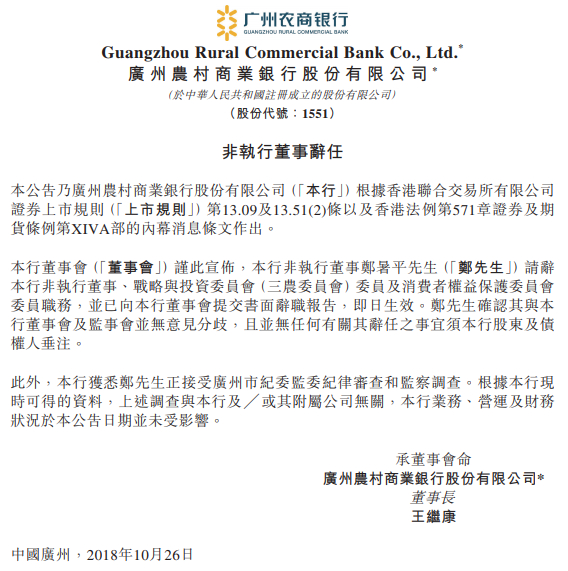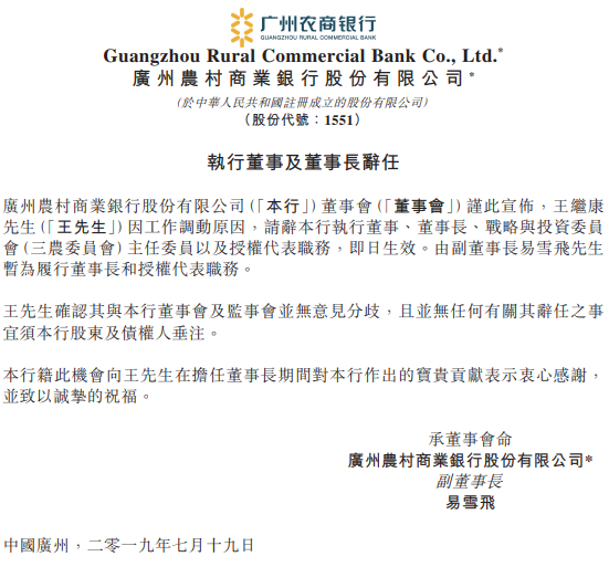 进入2018年,广州农商行似乎被施了“魔咒”。2018年10月,广州农商行董事郑暑平辞职、被查,两份公告前后相隔不到一周时间;2019年7月底,广州农商行原董事长王继康离职,8月被查……