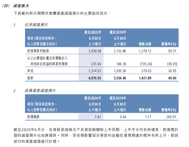 其2020年半年报显示,上半年,广州农商行抵债金融性资产减值损失161万元,同比增速265.91%。信用减值损失49.77亿元,同比增速40%,其中发放贷款和垫款的减值损失为34.31亿元,同比增长59.37%,系信用减值损失主要组成部分。
