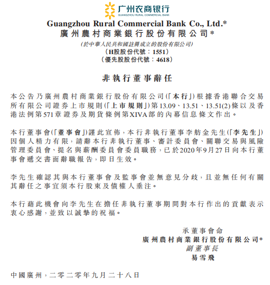 9月28日,广州农商行公告称,李舫金因个人精力有限,于2020年9月27日向董事会书面申请辞去非执行董事、审计委员会、关联交易与风险管理委员会、提名与薪酬委员会委员职务。