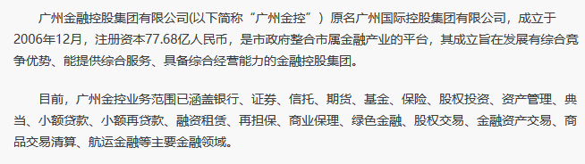 广州金控官网显示,广州金融控股集团有限公司原名广州国际控股集团有限公司,成立于2006年12月,注册资本77.68亿元,是广州市政府的金融投资管理平台,也是广州本土金融要素的重要持股方。目前,广州金控业务范围已涵盖银行、证券、信托、期货、基金、保险、股权投资、资产管理、典当、小额贷款、小额再贷款、融资租赁、再担保、商业保理、绿色金融、股权交易、金融资产交易、商品交易清算、航运金融等主要金融领域。