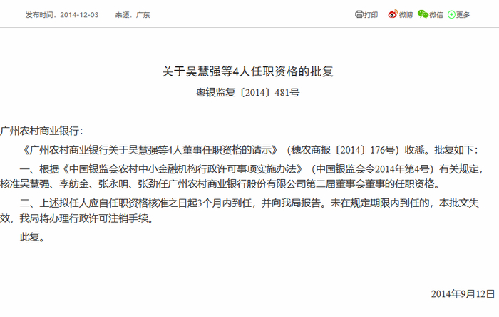 据了解,和7月被查的彭志军一样,李舫金也曾在广州农商行任职,担任该行董事。2014年9月12日,银保监会网站披露的《关于吴慧强等4人任职资格的批复》显示,核准吴慧强、李舫金、张永明、张劲任广州农商行第二届董事会董事的任职资格。