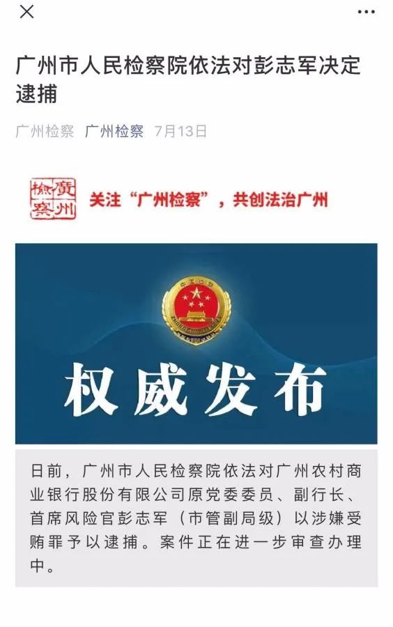 今年7月13日,广州市人民检察院官微“广州检察”披露,日前,广州市人民检察院依法对广州农商行原党委委员、副行长、首席风险官彭志军(市管副局级)以涉嫌受贿罪予以逮捕。案件正在进一步审查办理中。