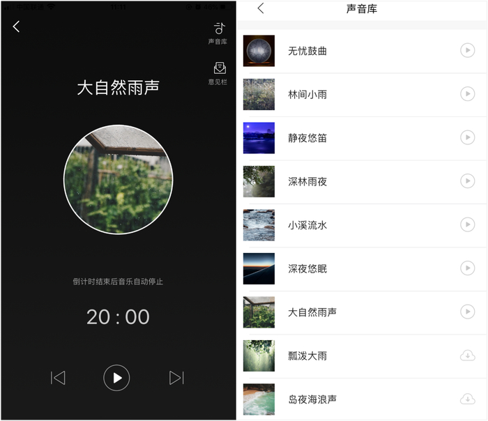 APP里还内置了助眠声音库,引导你身心放松,帮助你轻松入眠睡得香。