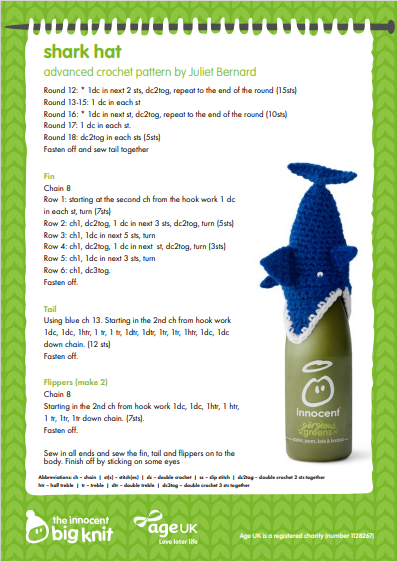 Big Knit 官网为我们提供了不同难度的图文编织教程。指南用字母缩写提示各行列该织多少针、用什么颜色。如果你偷看过妈妈们的毛衣书,大概能看懂这份谜语。比如这只鲨鱼帽,注意它的鲨鱼嘴、鳍、尾巴,每个地方都有说明事项。