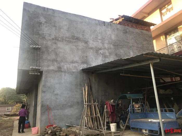 范家远离村子中心。相对于其他村民动辄三四层,越盖越大,精心装修的房屋,范家2014年修建的两层楼房显得过于简陋。盖新房一共花了十多万元,政府补贴了一万六千多元,范家发花光了自己的积蓄,还借了钱,只勉强修了两层毛胚房,但房屋的墙体裸露,顶层透风。