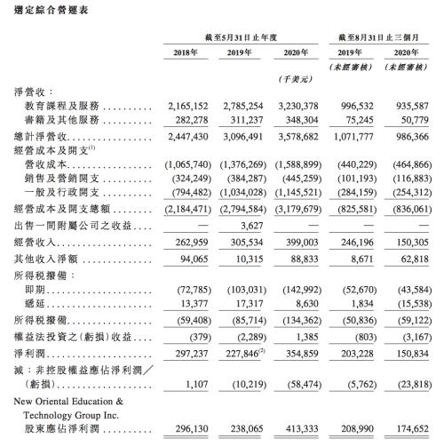 文件显示,新东方的总计净营收由截至2018年5月31日止财年的24.47亿美元增至截至2020年5月31日止财年的约35.79亿美元,复合年增长率为20.9%。股东应占净利润由截至2018年5月31日止财年的2.96亿美元增至截至2020年5月31日止财年的4.13亿美元,复合年增长率为18.1%。