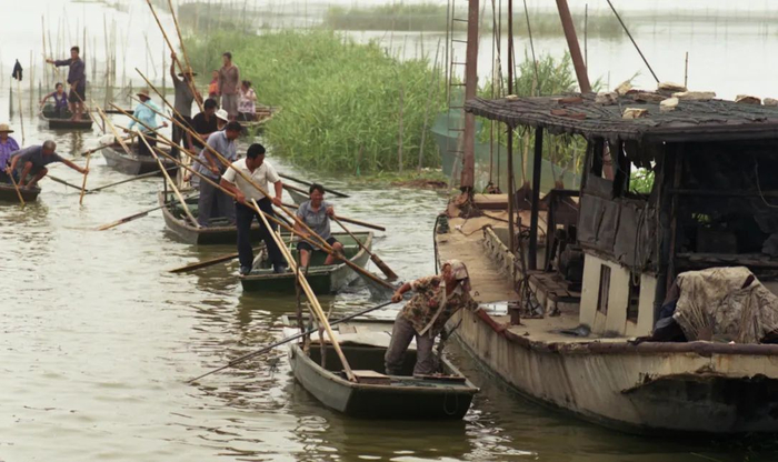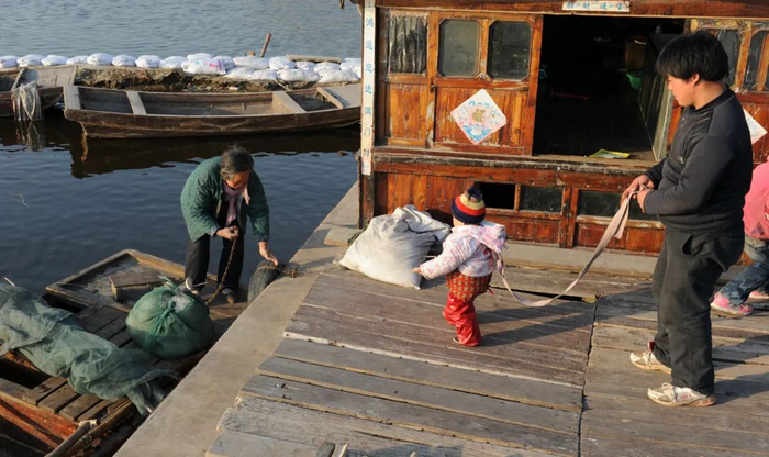 在这里看到的景象,与乐观、豁达的歌词形成了极大反差:一艘船,载着网、罱、罾、箔、叉,载着柴米油盐锅碗瓢盆,载着妻儿老小一家,也载着鸡狗鹅鸭。