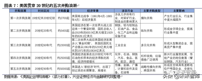 自 20 世纪初以来,直至次贷危机,美国共历经六次并购浪潮,加速各大产业的整合进程。前五次并购浪潮分别发生在 1897-1904 年、1916-1929 年、1965-1969年、1984-1989 年和 1991-2000 年,并购数量由第一次浪潮的约 2700 起上升到第五次浪潮的 50000 起,行业范围覆盖制造业、金融业、高新技术产业等,加速了各大产业的整合进程。而由次贷危机带来的第六次并购浪潮,是全球并购浪潮的重要组成部分,当前仍在进行中。