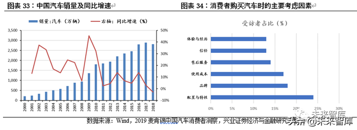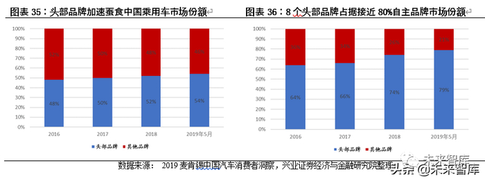 品牌主导汽车消费选择,头部品牌加速蚕食市场份额,行业集中度持续提升。汽车行业需求增速趋缓,2018 年,汽车销量为 2808.06 万辆,同比下跌 2.76%。在汽车需求下行的背景下,品牌成为汽车行业的护城河。在汽车制造技术趋于成熟的今天,配置与特性无法成为壁垒,而品牌开始主导对汽车的消费选择。由《2019 麦肯锡中国汽车消费者洞察》可知,有 44%的受访者在购买汽车时,会考虑与品牌相关的因素。品牌车企开始加速蚕食市场份额,以自主品牌市场为例,自主品牌的 8 个头部品牌对自主品牌市场销量占比在 2016 年为 64%,而到了 2019 年 5 月为 79%。汽车行业整体的集中度也在持续上行,2016 年中国乘用车市场头部品牌集中度(CR9)为 48%,而在 2019 年 5 月达到 54%。