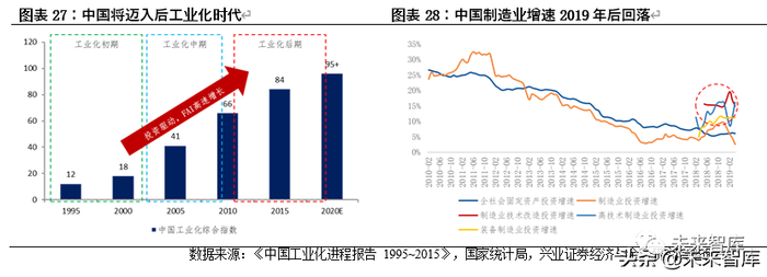 中国将迈入后工业化时代,制造业由增量竞争逐步转向存量竞争,产能呈现集中趋势。目前中国已进入到工业化后期向后工业化时代过渡的阶段。制造业将从增量竞争转向存量竞争,2019 年之后,制造业投资增速回落,1-4 月份制造业投资同比增长 2.5%,增速比一季度回落 2.1 个百分点。制造业产能呈现集中化趋势。目前集中化程度较高的行业如机械行业,强者恒强格局已逐渐明朗化;目前集中度程度依然较低的行业如钢铁行业,并购重组已成大势所趋,产业集中度也将持续提升。