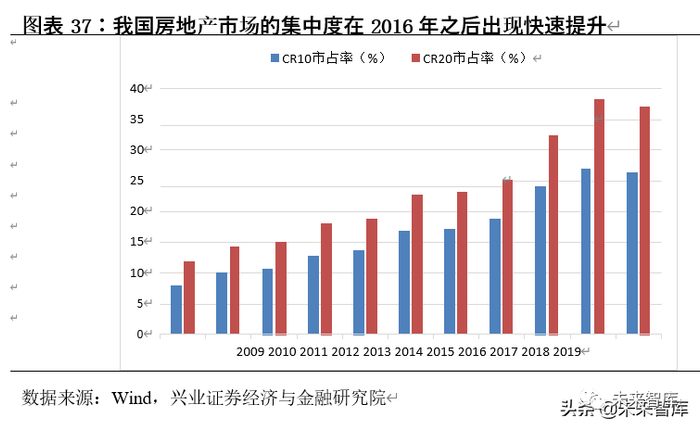 行业扩张受限,龙头房企的集中度优势进一步提升。近年来,我国房地产行业扩张受限,2019 年,我国商品房销售面积 1.72 亿平方米,同比下滑 0.06%,这也是98 年以来第三次出现增速为负的情况,并且连续三年增速低于 10%。然而,头部房企由于布局广泛、品牌影响力以及周转率等优势,具备更强的融资能力、拿地能力与经营能力;中小房企则面临着资金链断裂的风险及地价居高不下的窘境。对核心资源(土地、资金)的获取能力帮助头部企业穿越周期,在行业增长放缓中获得更多的市场份额。房地产业集中度持续提升,前 10 大房企的市场份额由2016 年的 18.7%逐年上升至 2019 年的 26.3%;前 20 大房企的市场份额由 2016 年的 25.2%上升至 2019 的 26.3%,行业分化加剧。