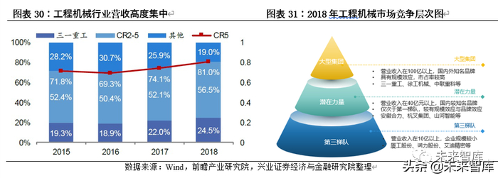 机械行业是集中度提升,强者恒强的典型代表。机械行业已进入成熟期,强者恒强格局相对明朗。2015-2018 年,工程机械板块营收规模前 5 名分别为三一重工、徐工机械、中联重科、上海机电、柳工,营收占板块比重从 71.8%上升到 81.0%, 集中度提升了 9.2 个百分点。环保整治、兼并重组下落后产能逐步退出市场,而在规模、产能投资、技术等方面占有的龙头企业则进一步扩大领先优势。