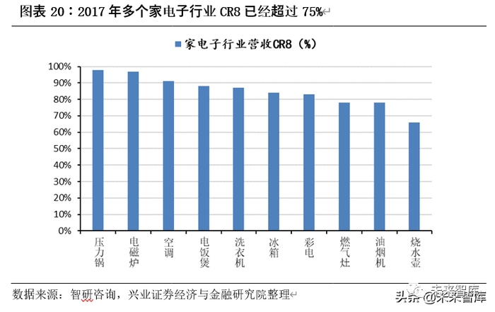 消费升级背景下,龙头企业凭借品牌、渠道优势加固“护城河”。以家电行业为例,2019 年家电和音像器材零售额为 9139 亿元,较 2017 年下降 3.33%。从主要家电品类来看,多个主要家电品类的销售额都呈下降态势:2019 年空调销售额为 2009 亿元,同比下滑 3.63%;洗衣机销售额为 711 亿元,同比下降 0.59%;吸油烟机销售额为 383 亿元,同比下降 3.94%,家电行业的需求呈收缩态势。随着市场转向存量竞争,未能及时把握市场需求变化和营销能力弱的中小企业被迫出局,实力雄厚的头部企业如格力、美的等却凭借品牌效应、产品质量等优势,构建起坚实的护城河。从多个家电子行业的收入 CR8 来看,2017 年时,多个家电子行业的营收 CR8 已超过 75%,家电行业集中度较高。