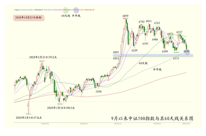 我此前多次强调中证500更能客观反映大盘7月中旬3458点以来的实际状况。9月以来,中证500一直在进行60天线争夺战:9月9日击破60天线后,最低跌至9月11日;接着到9月20日第一次冲击60天线;随后再次下跌,最低跌至9月30日;接着到10月13日第二次冲击60天线;随后再次下跌,周五(10月23日)最低已逼近半年线。