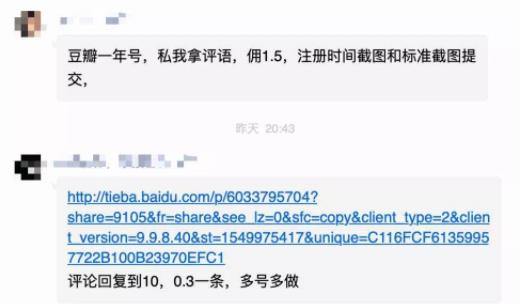 同任何一个步入规模化专业化阶段的产业一样,豆瓣水军内部正在逐步细分,形成了一个层级分明的链条:处在链条顶端的是“大老板”,通常将自己的公司注册为“XX文化宣传公司”,负责从项目宣发方或直接从项目方处接活儿,手握大量微信群;中层的是大大小小的组织者,负责“拉人头”,拉来之后还要审核是否是“正常账号”,在水军评论发布之后需要截图保存,并在表格里汇总链接,按基层水军人头抽成,一人抽十多块到几十块,“赚得多的,能拉将近1000人,一部电影就能赚到两三千”,但代价是“会很累”,因为对方几乎是随时都在手机和电脑上同时跟很多人聊天;