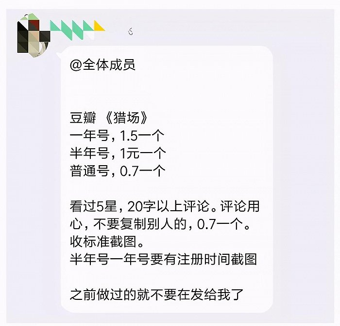 总体而言,按照手中掌握账号的质量等级,他们一般分为两种套路:一种走量,一大堆人集体刷分,只要有豆瓣账号就去疯狂刷五星,但是由于过于明显,通常会被豆棒反作弊机制察觉并过滤掉;一种走质,要求高质量无违规的账号,以后者为例,100粉以上报酬为三四十元一条,500粉以上50元一条,1000粉以上100元一条,大V另计,大致几千至上万一条。