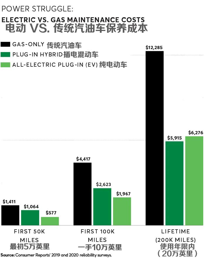 ▲《消费者报告》对比电动汽车和传统汽油车的保养费用