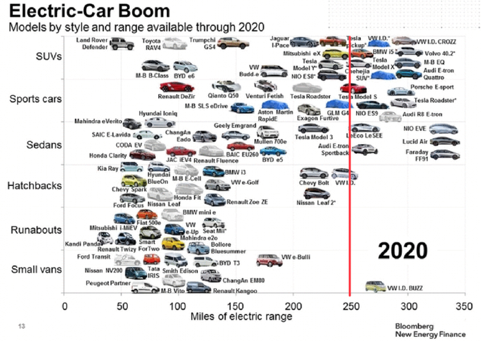 ▲红线处为2020年市面上续航里程数在250英里的电动汽车。图片来源:彭博社新能源财经
