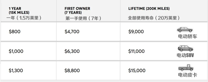报告显示,驾驶7年,即车主一手用车时间内,电动汽车较轿车节省燃料成本4700美元(3.1万人民币),较SUV节省6300美元(4.2万人民币),较皮卡节省8800美元(5.94万人民币)。