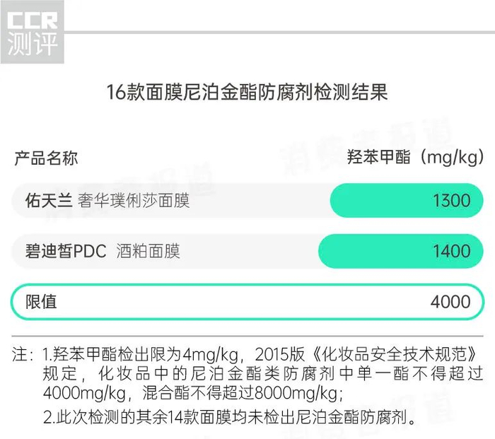 在此次检测的16款面膜中,佑天兰、碧迪皙PDC两款检出了安全性具有一定争议的尼泊金酯防腐剂中的羟苯甲酯,含量分别为1300、1400mg/kg,未超出我国要求限量,且相对于长链酯类,羟苯甲酯的风险更低一些。
