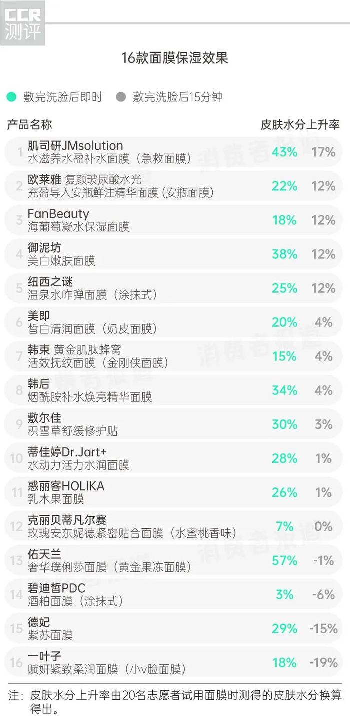 测试数据显示,所有16款面膜刚刚使用完皮肤水分会提升较多,其中佑天兰、肌司研JMsolution即时补水效果最好,敷完面膜洗脸之后皮肤水分平均上升了57%、43%。