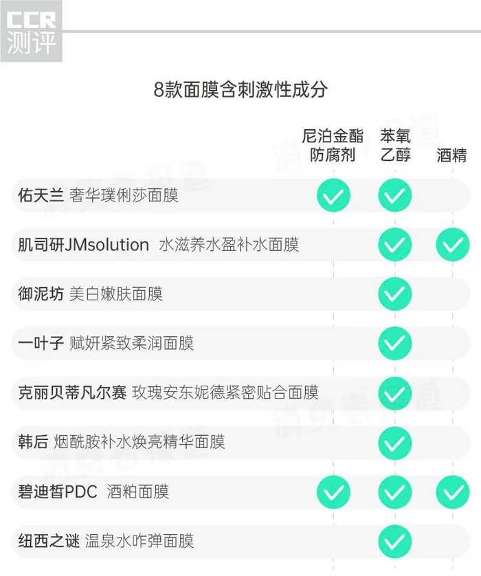 2. 佑天兰、御泥坊、一叶子、韩后、克丽贝蒂凡尔赛、肌司研、碧迪皙PDC以及纽西之谜8款面膜含有刺激性防腐剂苯氧乙醇或酒精;