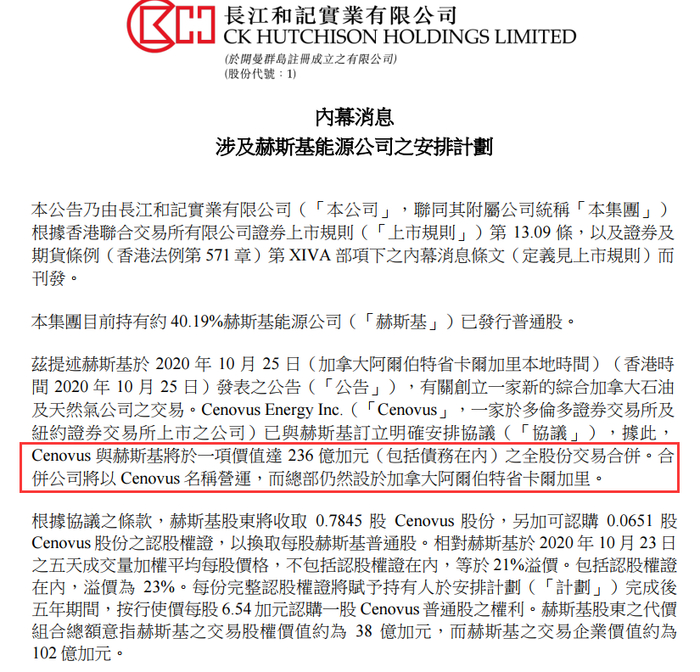 李嘉诚旗下的港股上市公司长和10月26日也发布公告,确认Cenovus与赫斯基将于一项价值达236亿加元(包括债务在内)的全股份交易合并。合并公司将以Cenovus名称营运,而总部仍然设于加拿大阿尔伯特省卡尔加里。