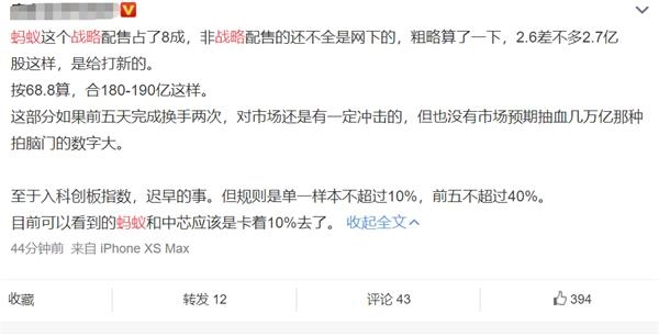 有业内人士表示,蚂蚁A股发行的战略配售比达80%,这应该是A股历史最高了,把战略配售比例提到如此之高,其目的估计是想减轻二级市场压力。