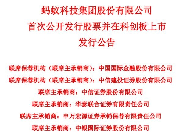 10月26日晚间,蚂蚁集团发布首次公开发行股票并在科创板上市发行公告,发行人和联席主承销商根据初步询价结果,协商确定本次发行价格为68.80元/股。