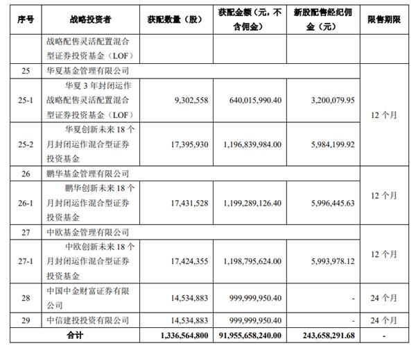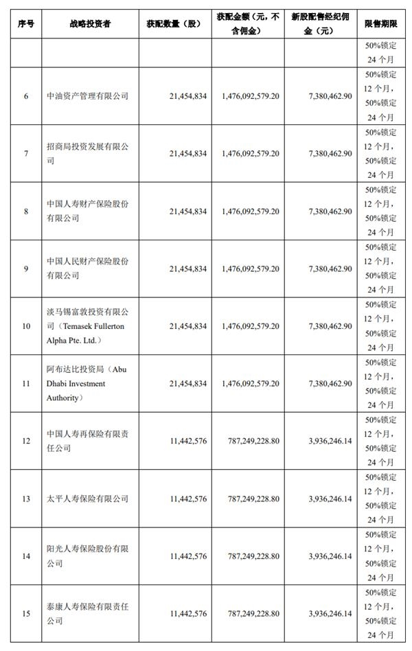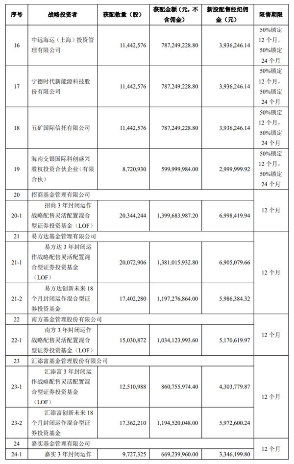 战略配售结果显示,天猫获配金额502.24亿元;淡马锡、阿布达比投资局等多家机构均获配14.76亿元;宁德时代获配7.87亿元。以及众多基金公司