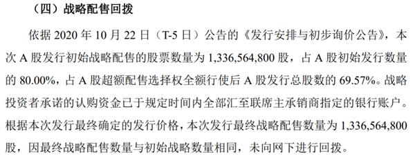 公告显示,本次A股发行初始战略配售的股票数量为 1,336,564,800 股,占 A 股初始发行数量的 80.00%