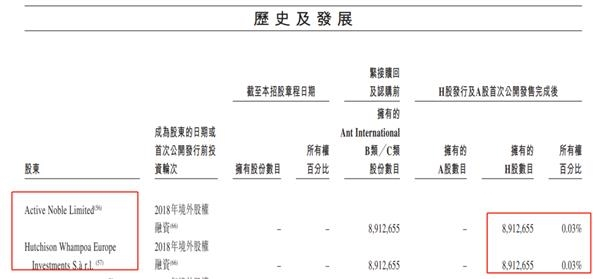 长和旗下Hutchison Whampoa Europe Investments、长实地产旗下Active Noble Limited分别持有891.27万股C类股份,总计持股蚂蚁集团0.06%