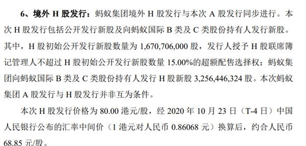 发行方案显示,蚂蚁将在A股发行不超过16.7亿股的新股,其中初始战略配售股票数13.4亿股,供机构和个人投资者“打新”股票数3.34亿股(绿鞋机制前)。按照每股价格计算,绿鞋前A股募资总规模为1150亿元,其中面向A股机构和个人投资者的“打新”规模超过220亿元。