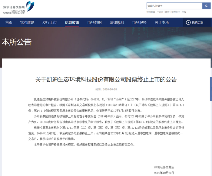 10月28日,深交所公告称,*ST凯迪(原凯迪生态,000939.SZ)因2017年、2018年连续两年财务报告被出具无法表示意见的审计报告,根据《深圳证券交易所股票上市规则(2018年11月修订)》(以下简称《股票上市规则》)第14.1.1条、第14.1.3条的规定及深交所上市委员会的审核意见,公司股票于2019年5月13日暂停上市。