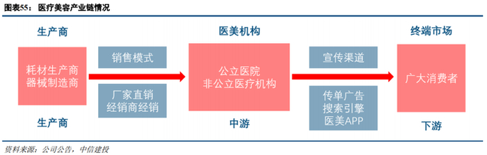 医美上游技术壁垒高,透明质酸龙头毛利率高达90%+。医疗美容产业链中,行业上游为医疗美容耗材的生产商和器械设备的制造商,行业中游为医疗美容机构,包括公立医院的整形外科、皮肤科和民营医疗美容机构,下游为广大终端消费者。由于医药领域的特殊监管政策,产品需要进行临床试验并获取国家药品监督管理局批准,再加上对公司技术储备、研发支持和工艺积累要求高,行业上游进入门槛相对较高,参与者相对较少,其中透明质酸龙头厂商毛利率在90%+。