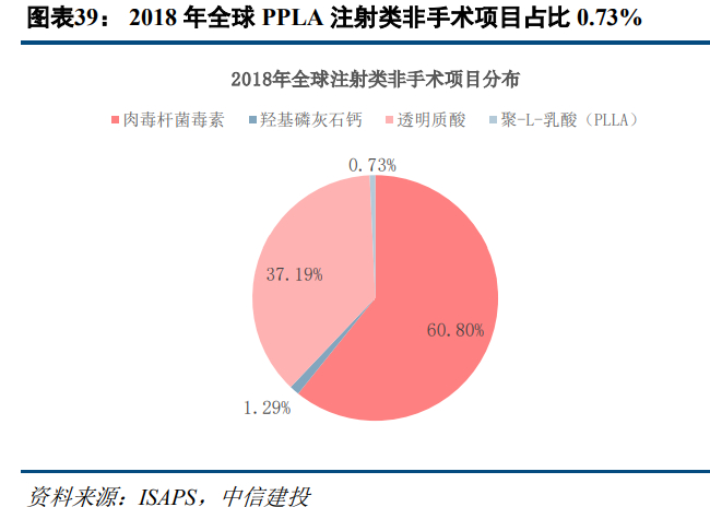 产品对比看,1)玻尿酸产品主要是通过物理填充,实现塑性、填充效果,术后立竿见影,维持时间通常在3-12个月。由于注射用透明质酸多需使用交联技术,其中使用的化学交联剂可能会激发人体排异反应、降解较难,进而导致注射后产生红肿发炎等反应。2)肉毒毒素为含有高分子蛋白的神经毒素,通过拮抗作用使肌肉保持松弛甚至萎缩,实现除皱、瘦脸、瘦身效果,起效时间约7-10天,维持时间一般为6-8个月。加入微量肉毒毒素后,既能够有效抑制神经末梢释放乙酰胆碱,又不引起强烈的免疫反应,具有良好的医美安全性和使用效果。3)童颜针含有的聚左旋乳酸在体内经过酶分解会降解成左旋乳酸,能促进皮肤表皮层细胞新陈代谢,刺激胶原蛋白增生,达到紧致嫩肤的作用,起效时间通常需2-6周,产品效果更自然真实,维持时间可长达1-3年。由于人体对左旋化合物相容性良好,出现排异反应的可能性较低。根据沙利文测算,2019年中国玻尿酸、肉毒毒素市场规模分别为48、36亿元,预计到2024年可增至120、80亿元。而童颜针尚处于起步阶段,成长前景广阔。