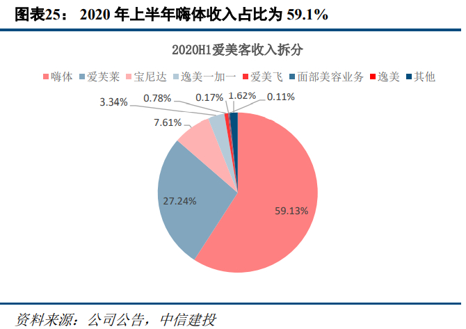 明星产品嗨体收入贡献过半,嗨体、爱芙莱和宝尼达占公司收入比重约94%。嗨体作为近年公司的爆款注射用玻尿酸产品,收入从2017年的0.34亿元快速增加至2019年的2.43亿元,2019年同增223.6%,2020H1嗨体收入1.43亿元,新冠疫情之下仍同增57.3%,占比59.1%,现为公司第一大产品,2020H1毛利率达到91.09%;爱芙莱产品近年稳定增长,2019年收入2.19亿元,同增15.1%;宝尼达2019年收入0.68亿元,同增100.7%。