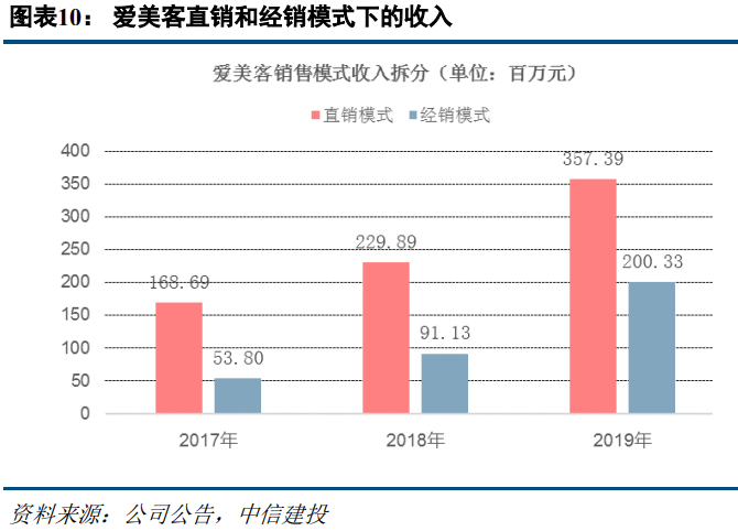 公司以直销渠道为主,有助于及时把握市场需求,快速服务客户。公司采取“直销为主、经销为辅”的销售模式,已形成了以北京为中心,覆盖全国 31 个省、市、自治区的销售网络,最终客户涵盖大型连锁非公立医疗机构和多家三甲公立医院。2019年公司直销占比为64.1%,高于华熙生物、昊海生物。公司的直销客户以非公立医疗机构为主,2019年占直销比重的99.5%,高比例直销模式有助于公司快速准确把握市场需求、增强对市场的控制力,树立良好品牌形象,及时做好售后服务工作。