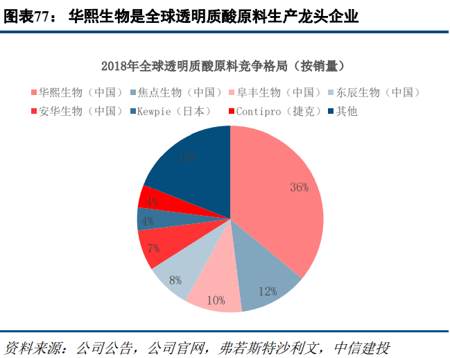 国内透明质酸市场仍以进口主导,国产品牌市占率有望进一步提高。国内玻尿酸品牌供给较为丰富,国内获批玻尿酸已有17家企业(9家国产,8家进口)。从销量来看,国产品牌已占据半壁江山,龙头三家企业昊海生科、爱美客、华熙生物实现一定突破,2019年合计占比54.6%。从销售额来看,由于进口品牌单价较高,仍以韩国LG、美国Allergan、韩国Humedix等占据主导地位。但随着本土产品品类增加、技术和质量水平提升,国内玻尿酸产品功效已经能够媲美进口产品,加之国内产品价格远低于进口价格,本土品牌市占率有望继续提升。