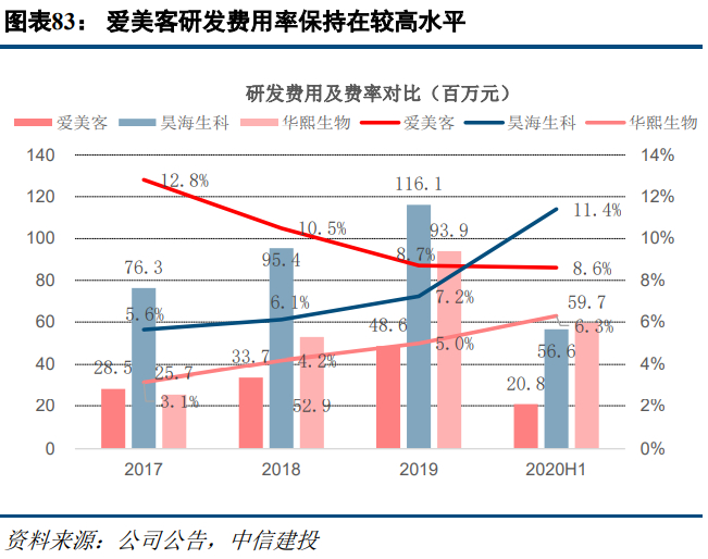 研发方面,华熙生物和昊海生科开创性研发实力较强,二者均拿过国家科学技术进步二等奖,其中,华熙生物的国家科技进步二等奖为国际领先的微生物发酵法生产透明质酸技术。截至2019年底,华熙生物和昊海生科研发团队均在260人以上,2019年两公司研发费用分别为1.16、0.94亿元,研发费用率分别为7.2%、5.0%。爱美客2019年底研发团队共72人,团队规模虽相对较小但研发费用率处于较高水平,2019年研发费率为8.7%。