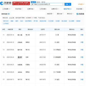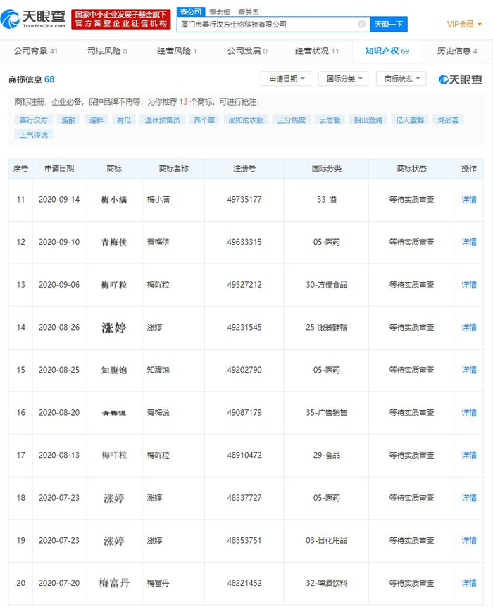 天眼查APP显示,近日,厦门市善行汉方生物科技有限公司新增多条商标信息,包括“涨婷”、“知腹饱”、“梅吖粒”、“梅富丹”等,涉及国际分类包括服装鞋帽、医药、食品、啤酒饮料等,目前上述商标状态均显示为“等待实质审查”。