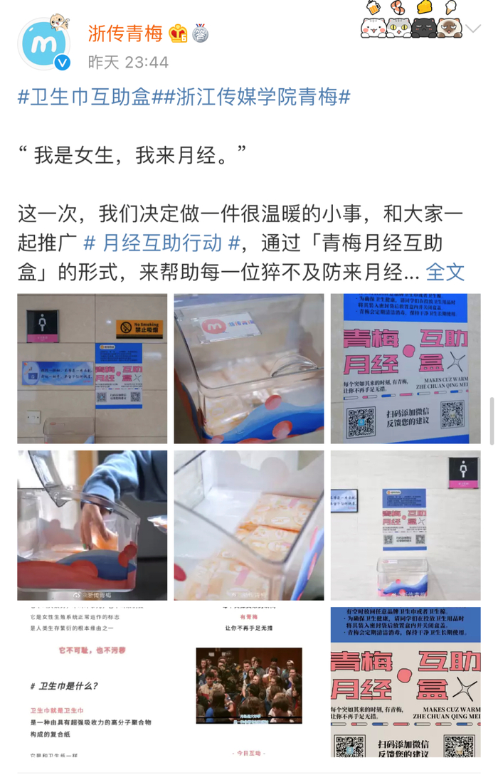 10月27日,浙江传媒学院新闻与传播学院浙传青梅手机客户端官方微博账号@浙传青梅发布消息称,@浙传青梅定制了专门放置卫生巾的互助盒,试图通过“青梅月经互助盒”的形式,帮助每一位猝不及防来月经的女生。