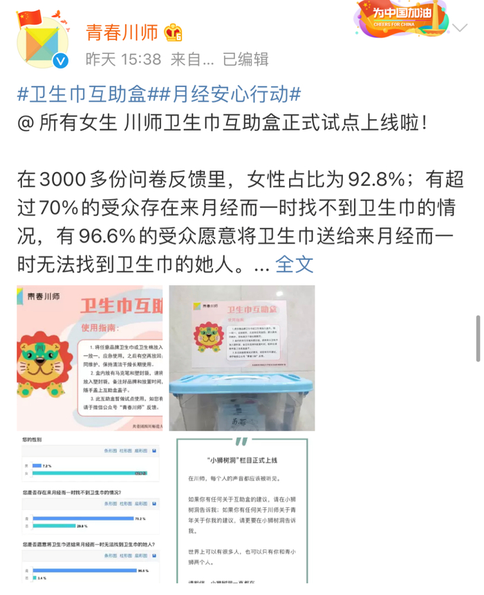 澎湃新闻注意到,27日,四川师范大学也开启了为期一周的“卫生巾互助盒”试点计划。27日,共青团四川师范大学委员会官方微博@青春川师发布消息称,川师卫生巾互助盒正式试点上线。