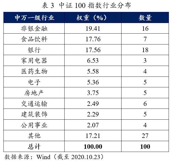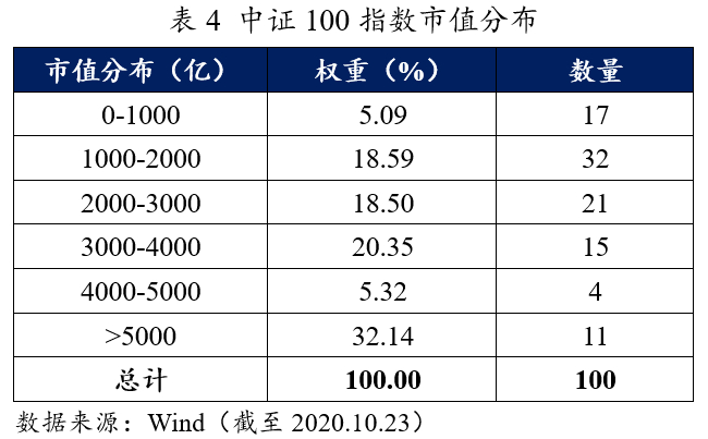 中证100指数由沪深300指数成份股中规模最大的100只股票组成,是蓝筹股票中核心企业的聚集地,综合反映中国A股市场中最具市场影响力的一批超大市值公司的股票价格表现。中证100指数与沪深300、中证500、中小板以及创业板等指数共同组成了A股市场最为核心的宽基指数体系。截至2020年10月23日收盘,中证100指数总市值达到3.09万亿元,平均个股市值3090亿元,呈现大盘价值股的特征。
