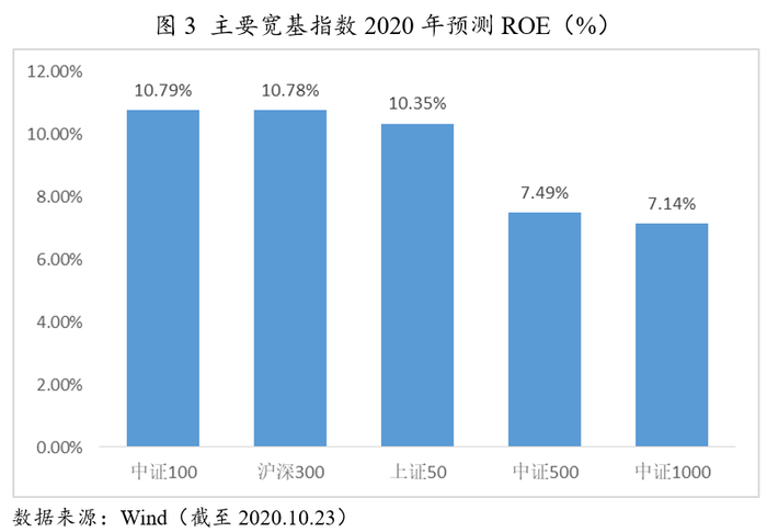 从指数盈利预测来看,2020年中证100指数净资产收益率(ROE)预期为10.79%,高于其他宽基指数;从个股来看,2020年中证100指数中预期将有20只股票ROE超过20%,合计权重高达35.69%。