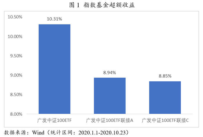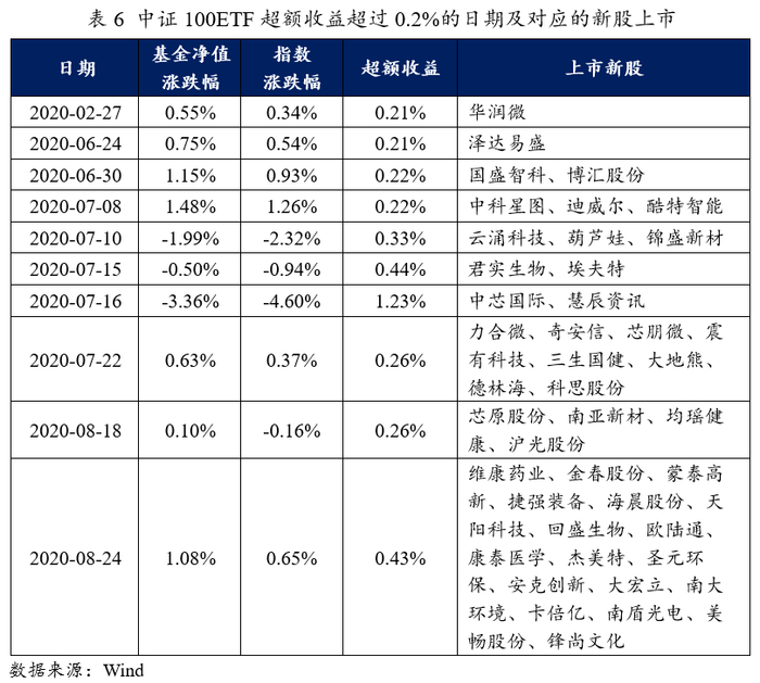 今年以来截至10月23日收盘,中证100ETF(512910)累计超额收益高达10.31%,其中大部分超额收益是通过打新而来。通过统计,2020年以来中证100ETF单日超额收益超过0.2%的天数共十天,分别对应着较大规模的新股上市。例如在7月16日中芯国际上市当日,中证100ETF超额收益高达1.23%。