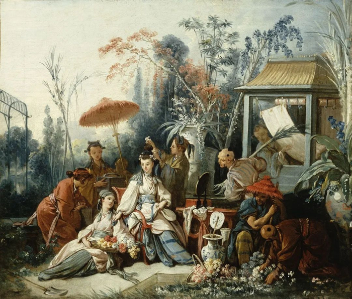 半个多世纪后路易十五宫廷的首席画师,洛可可风格代表人物弗朗索瓦·布歇(François Boucher)对中国也产生了极大的兴趣。他笔下布满中国艺术品的欧洲宫殿美轮美奂,毫无违和感。