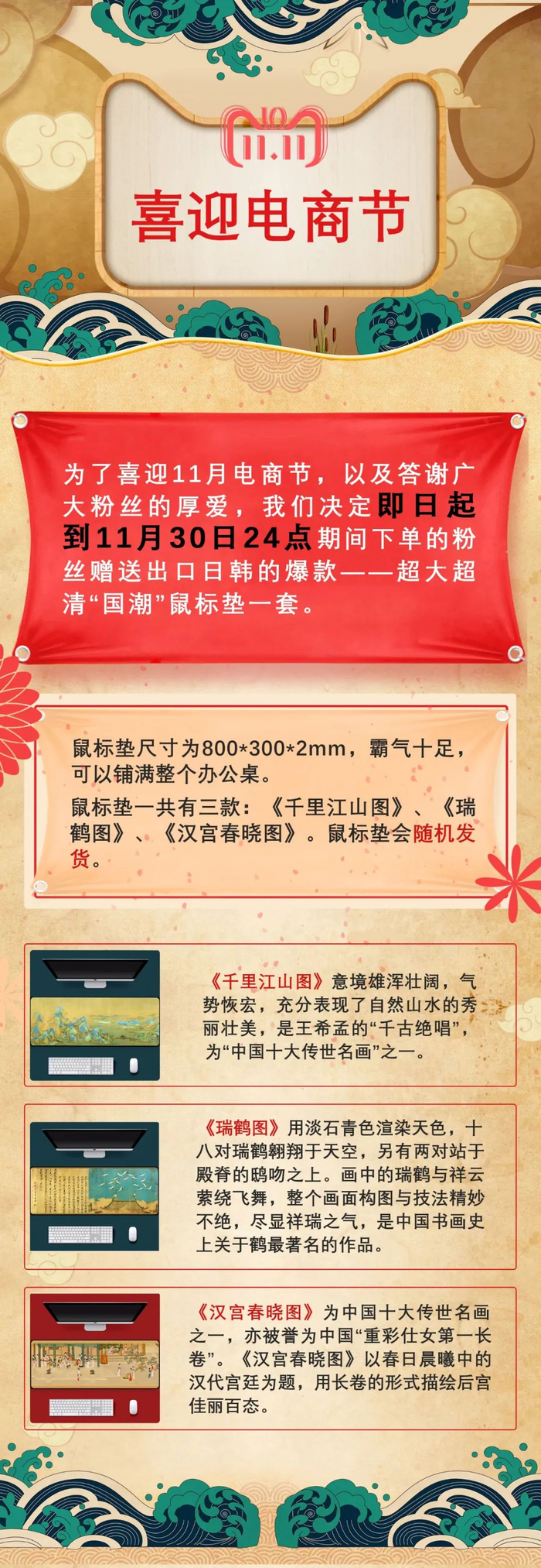 为了喜迎11月电商节,以及答谢广大粉丝的厚爱,我们决定即日起到11月30日24点期间下单的粉丝赠送出口日韩的爆款——超大超清“国潮”鼠标垫一套。不管您是购买《紫禁宝藏》集邮护照,还是购买《中国十大名画整版珍邮》,还是两套一起购买,统统赠送一套鼠标垫。(数量有限,送完即止)