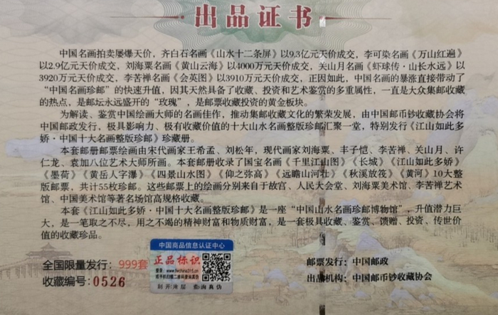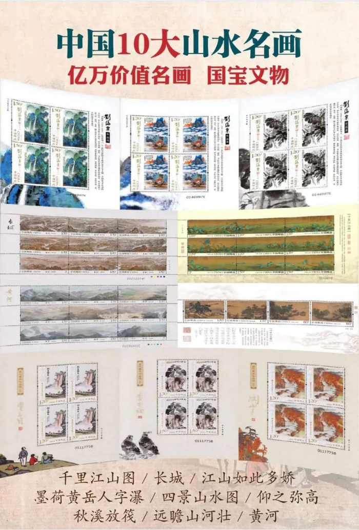十大整版珍邮的图案均来自中国十大国宝级山水名画,名画由8位中国顶级艺术大师倾心创作。