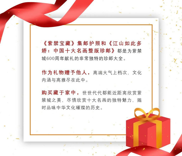《紫禁宝藏》集邮护照和《江山如此多娇:中国十大名画整版珍邮》都是为紫禁城600周年献礼的非常独特的珍邮大全。